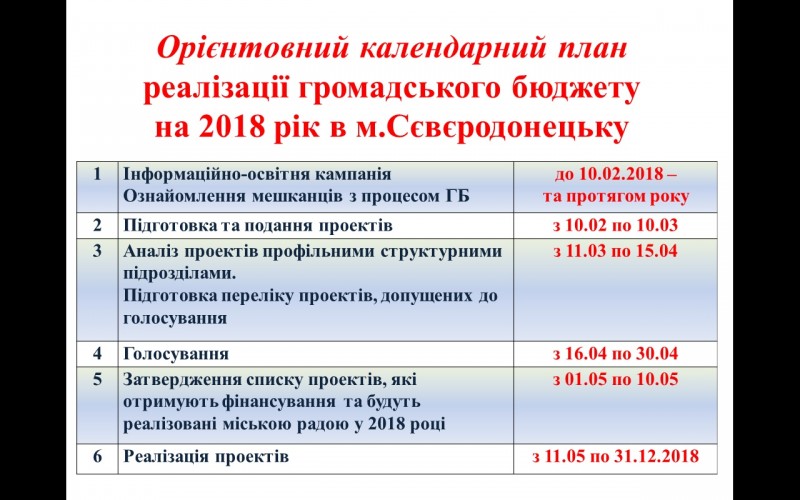 В конце заседания был утвержден ориентировочный календарный план реализации общественного бюджета на 2018 год. До 10 февраля будет проводиться рекламная компания в городе, до 10 марта будут приниматься работы и проекты от граждан, а с 10 мая по 31 октября выбранные северодончанами проекты будут реализовываться.
