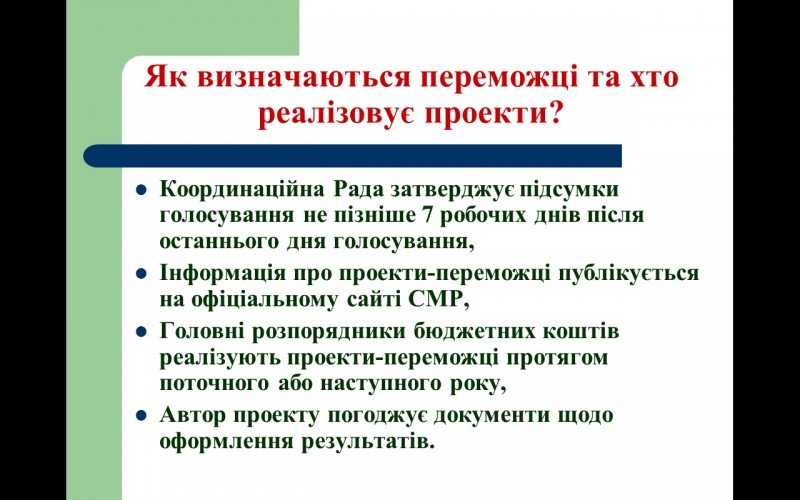 «Общественный бюджет - это проект, когда часть средств из городского бюджета выделяется собственно на реализацию проектов, которые подают жители, а позже выбирают путем голосования или достижения общественного согласия, и потом на следующий год городская власть обязана их реализовать. Это очень важно, поскольку этот первый проект в Украине, который позволяет непосредственно услышать мнение жителей, а также наладить диалог между обществом и властью. Власть, в частности, имеет возможность услышать потребности общества, а жители города могут участвовать в управлении городом, в управлении городскими процессами», - подчеркивал Донос.