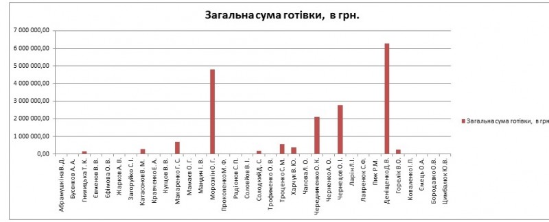 Согласно обнародованным данным в разделе «Общая сумма наличности», наибольшую сумму наличных задекларировали Денищенко – 6 миллионов 278 тысяч, Морозкин – 4 миллиона 806 тысяч, Чернецов – 2 миллиона 780 тысяч и Чередниченко – 2 миллиона 105 тысяч гривен.