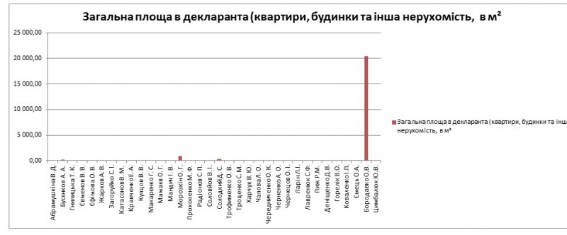 Наибольшую общую площадь семей декларанта задекларировали Троценко - 304,0 м²., Морозкин - 237,20 м² и Чернецов - 208,0 м². Общую площадь семьи декларанта в «0 м²» в разделе «Квартиры, дома и другая недвижимость» в 2017 году задекларировали 22 депутата: Абрамушкина, Бусенков, Евменов, Ефимова, Жарков, Загоруйко, Катасонов, Кравченко, Макаренко, Мамаев, Мандрич, Прокопенко, Соловьев, Трофименко, Чередниченко, Черненко, Ларин, Лавренюк, Пыж, Емец, Бородавко, Цимбалюк.