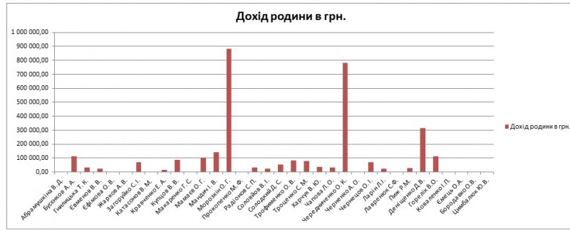 Наибольший доход своей семьи в 2017 году задекларировали депутаты Морозкин - 884 тысяч, Чередниченко - 781 тысяча и Денищенко - 315 тысяч гривен. Сумму «ноль гривен» в разделе «Доход семьи» в 2017 году задекларировали 11 депутатов: Абрамушкина, Ефимова, Жарков, Катасонов, Макаренко, Черненко, Лавренюк, Коваленко, Емец, Бородавко и Цимбалюк.