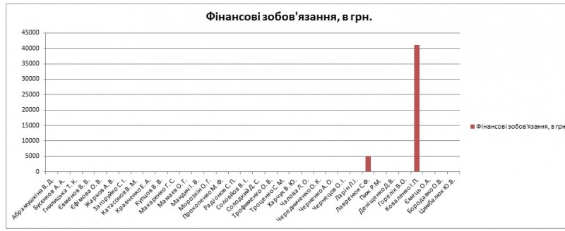 В разделе «Финансовые обязательства» только двое депутатов Лисичанского городского совета задекларировали 41 тысячу и 5 тысяч гривен финансовых обязательств - Коваленко и Лавренюк соответственно. Остальные 33 депутата задекларировали в этом разделе сумму «ноль гривен».