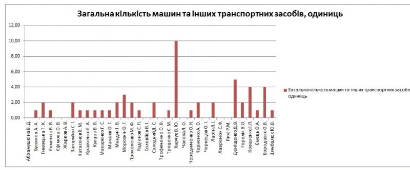 В разделе «Машины и другие транспортные средства» наибольшее количество задекларировали Харчук - 10 единиц, Денищенко - 5 единиц, Коваленко и Бородавко по 4 единицы. Не задекларировали ни одной машины и других транспортных средств 8 депутатов Абрамушкина, Ефимова, Жарков, Соловьев, Трофименко, Чапова, Чернецов, Лавренюк и Пыж.