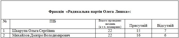 Больше остальных пропустил сессионных заседаний депутат от БПП Копылов - 41%, а меньше всех - Романов - 9%. У радикалов «лидером» прогульщиков стал Шкарупа - 32%, а самым дисциплинированным стал Михайлов - 27%.