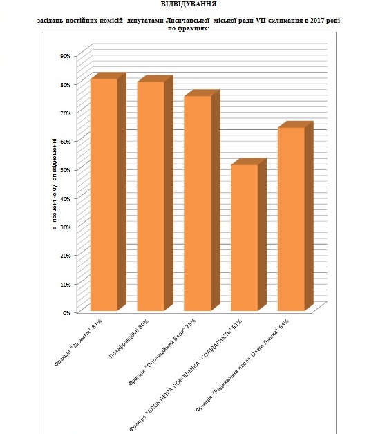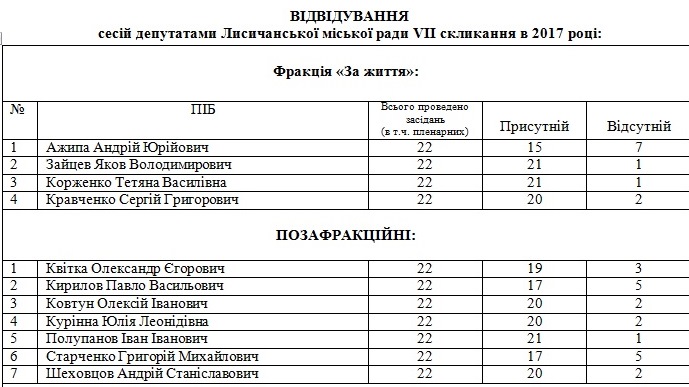 За 2017 год в Лисичанском городском совете VII созыва было проведено 22 заседания (в том числе и пленарных). Мониторинг посещаемости сессионных заседаний показывает, что наиболее дисциплинированной фракцией городского совета с 88% посещаемости является депутатская фракция «За жизнь». Наименее дисциплинированной фракцией с 70% посещаемости является фракция «Радикальная партия Олега Ляшко».