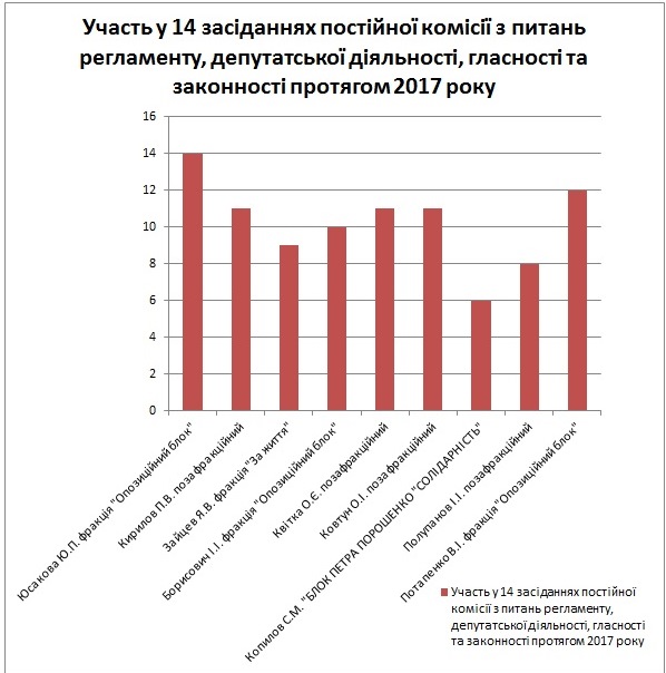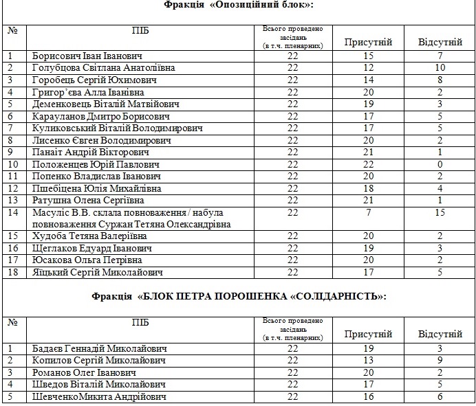 Наибольшая «прогульщица» фракции «Оппозиционный блок» - Виктория Масулис - 68%, в сентябре 2017 года сложила свои депутатские полномочия. Голубцова пропустила 45% заседаний, Воробьев - 36%, Борисович - 32%. Ни одного заседания в течение 2017 года не пропустил депутат фракции «Оппозиционный блок» Положенцев.