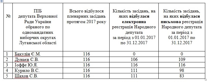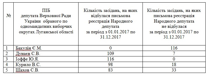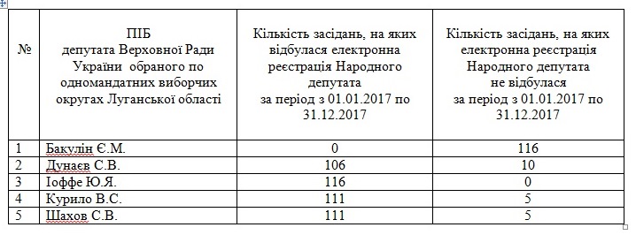 Таким образом, можно сделать вывод, что электронные карточки Депутатов Верховной Рады Украины избранных по одномандатным избирательным округам Луганской области в течение 2017 были зарегистрированы на пленарных заседаниях следующим образом: