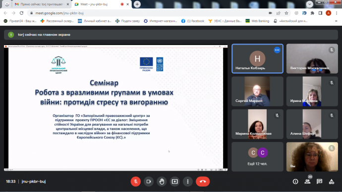 19 жовтня за ініціативи громадської організації «Запорізький правозахисний центр» відбувся психологічний онлайн семінар за темою “Робота з вразливими групами в умовах війни: протидія стресу та вигоранню” для соціальних працівників з Запорізької області.