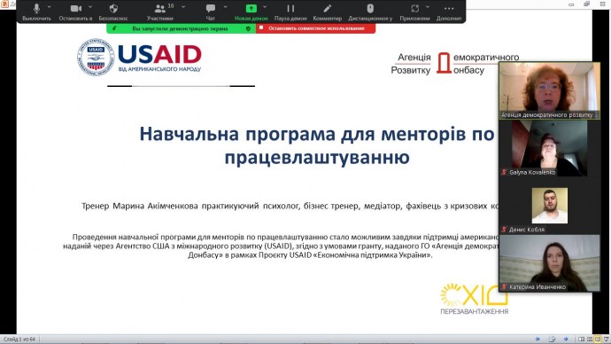 24, 25, 27 та 28 січня громадською організацією «Агенція демократичного розвитку Донбасу» було проведено навчання у рамках програми менторів з працевлаштування для 25 осіб з 10 цільових громад: м. Вільнянськ, м. Вільногірськ, м. Дніпро, м. Жовті Води, м. Запоріжжя, м. Кам’янське, м. Кривий Ріг, м. Новомосковськ, м. Павлоград, м. П’ятихатки. Навчання менторів реалізовано в рамках активності «Ініціатива зі сприяння працевлаштуванню осіб з інвалідністю в місцевих громадах Дніпропетровської та Запорізької областей» за сприяння Проєкту USAID «Економічна підтримка України».