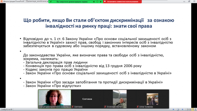 Під час тренінгу учасники дізнались що таке «Дискримінація» за ознакою інвалідності на ринку праці та як її ідентифікувати. Вивчили форми та прояви дискримінації за ознакою інвалідності на ринку праці, законодавчі та нормативно-правові акти щодо запобігання та протидії дискримінації.