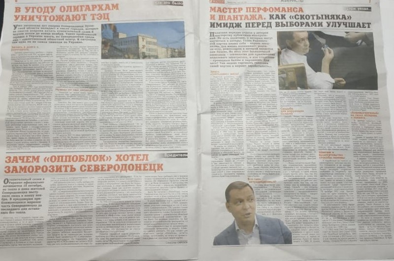 В то же время, большинство материалов газеты содержит информацию, которая имеет элементы компрометации представителей областной организации «Оппозиционного блока» (прежде всего, председателя Северодонецкой городской организации указанной партии Игоря Буткова) и партии вообще. Это публикации с названиями: «Маршрутки монополиста Букова похоронят троллейбусы», «Мастер бюджетной похоронной коммерции с 2010 года и до наших дней» (иллюстрированная стилизованным фото Игоря Буткова), «Досье. Бутков», «Зачем «Оппоблок» хотел заморозит Северодонецк» и «О захвате власти в Северодонецке и не только».