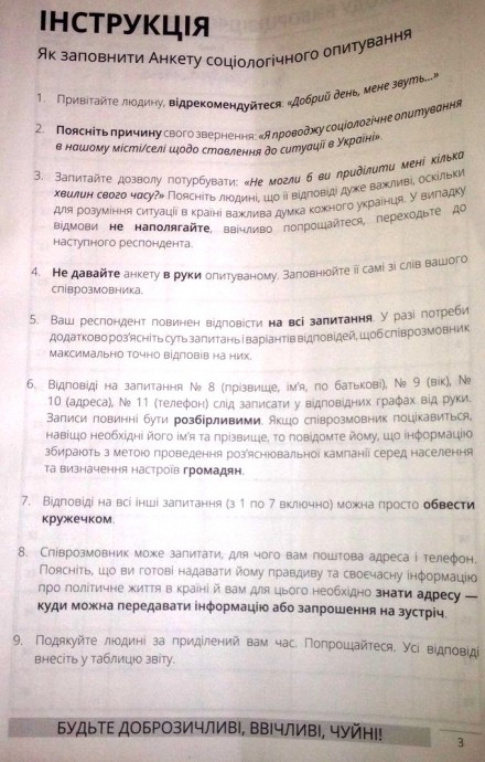 На правах анонимности потенциальный интервьюер рассказал, что «за выход», целью которого является сбор анкет 50 человек, интервьюер получает на руки 500 гривен. В общем к выборам планируется провести «четыре волны» таких опросов.