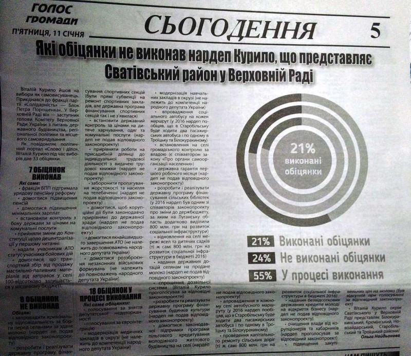 В то же время, зафиксировано 2 случая, когда деятельность политиков освещалась с элементами критики. В частности, это касается статей «Сватовская «медвежья услуга» Президенту» в газете «Сватовские ведомости» № 2 (688) от 9 января 2019 р.та «Какие обещания не выполнил нардеп Курило, представляющий Сватовский район в Верховной Раде» в газете «голос общины»№ 2 (853) от 11 января 2019 города Сватово относительно Президента Петра Порошенко и народного депутата Украины Виталия Курило соответственно.
