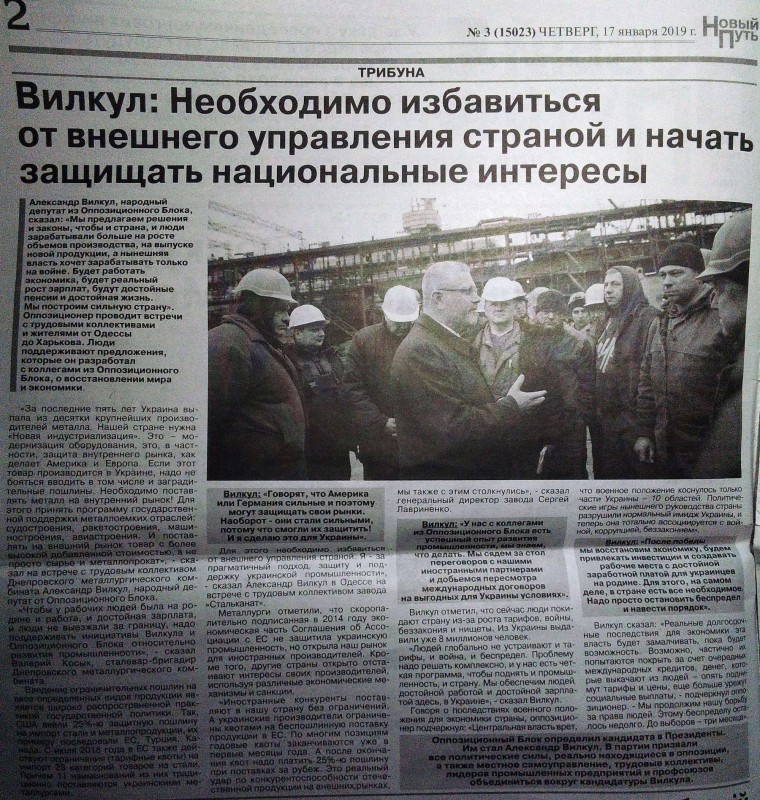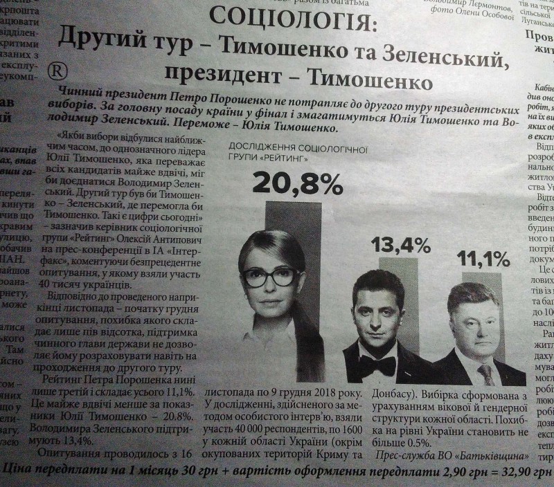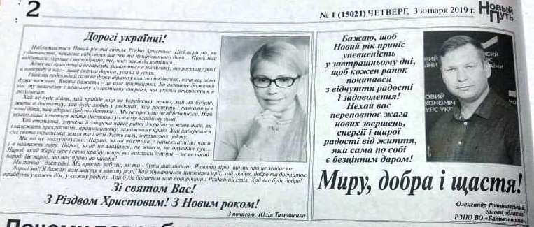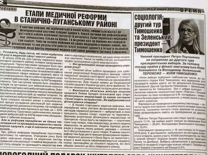 Печатные средства массовой информации были проанализированы по всем районам и городам области с 21 декабря 2018 по 22 января 2019 года. В результате анализа выяснилось, что системно представлены в двух третях изданий два политических деятеля - это Юлия Тимошенко и Сергей Шахов. Причем, лидер «Батькивщины» упоминается в прессе в большей части районов и городов области. Юлия Тимошенко, в основном, освещается с позиции новогодних и рождественских поздравлений, а также социологического опроса, в котором она представлена как лидер избирательной гонки и будущий президент ( «Северодонецкие вести» № 51 от 21 декабря 2018, «Новый путь» (г. . Лисичанск) № 1 (15021) от 3 января 2019, «Известия Маркивщины» №52 (10307) от 29 декабря 2018, «Слово хлебороба» № 52 (9692) от 29 декабря 2018 (Меловской район) , «Сельская новь» (Троицкий район) № 1 (11181) от 4 января 2019, «Жизнь Белокуракинщины» № 71 (10539) от 29 декабря 2018), «Время» (Станично-Луганский район) № 51 (11208) от 21 декабря 2018, № 1 от 4 января 2019.