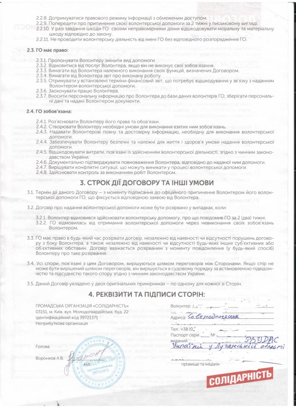 При этом он рассказал, что несмотря на условия «волонтерской соглашения» с общественной организацией «Солидарность», он как агитатор получал 200 гривен в день и дополнительно 10 гривен за заполненную анкету сторонника Петра Порошенко в агитационной палатке. При этом, заявитель раскрыл всю схему организации работы и распределения средств от главы городского штаба к проверяющим и рядовых агитаторов из числа своих «напарников».