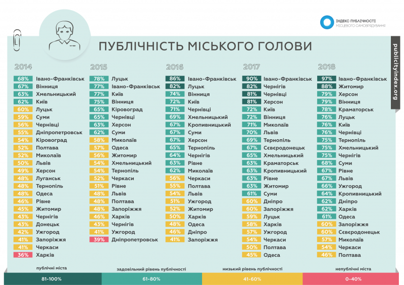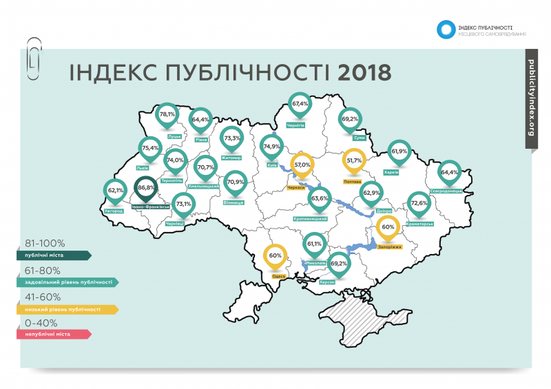 Довідково: Індекс публічності – це загальнонаціональна кампанія моніторингу прозорості, відкритості та підзвітності діяльності органів та посадових осіб місцевого самоврядування. Об’єктом моніторингу є міські ради в обласних центрах України. У 2019 році вимірювання здійснювалося також у тимчасово перенесених обласних центрах Донецької та Луганської областей. Проект реалізовується уже шостий рік поспіль й має на меті оцінити, наскільки публічно приймаються рішення і втілюється в життя політика муніципалітетів, і яким є внесок основних суб’єктів місцевого самоврядування – міського голови, депутатів та виконавчих органів – в цей процес. Система показників Індексу публічності розроблена на основі положень українського законодавства та міжнародних стандартів у сфері публічності муніципальної влади. Результатом проведеної кампанії є публікація щорічного всеукраїнського дослідження – «Індекс публічності місцевого самоврядування 2018».