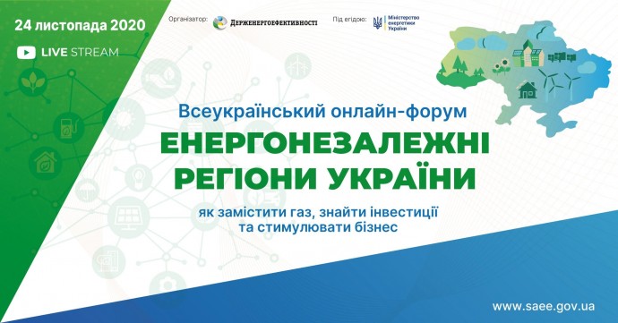 Здобуття енергонезалежності та сталий розвиток – один із пріоритетів України. Ключовими інструментами для цього є підвищення енергоефективності та розвиток «зеленої» енергетики. Тому 24 листопада 2020 р. Держенергоефективності під егідою Міненерго ініціює широкомасштабний Всеукраїнський онлайн-форум «Енергонезалежні регіони України: як замістити газ, знайти інвестиції та стимулювати бізнес».