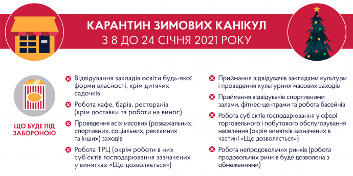 В Україні з 8 до 24 січня включно 2021 року будуть запроваджені посилені карантинні обмеження